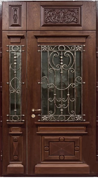 Поговорим об отделке. Вариантов декора дверей много. В большинстве случаев, для отделки элитных дверей используется массив натурального дерева или натуральный шпон с фрезеровкой. Цвет двери так же делается по желанию заказчика. Очень красиво и представительно выглядят двери с ковкой и стеклом.