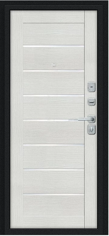 Надежная входная Дверь Браво Техно/BChrome Букле черное/Bianco Melinga премиум класса по цене 34 687 руб. Большая толщина стали защитит от проникновения в ваш дом, квартиру или коттедж. Используется очень качественная фурнитура: замки, цилиндры, ручки, защелки. Покрытие и отделка двери изготовлено под внимательным контролем производителя. Дверь имеет долгий срок службы и гарантию.